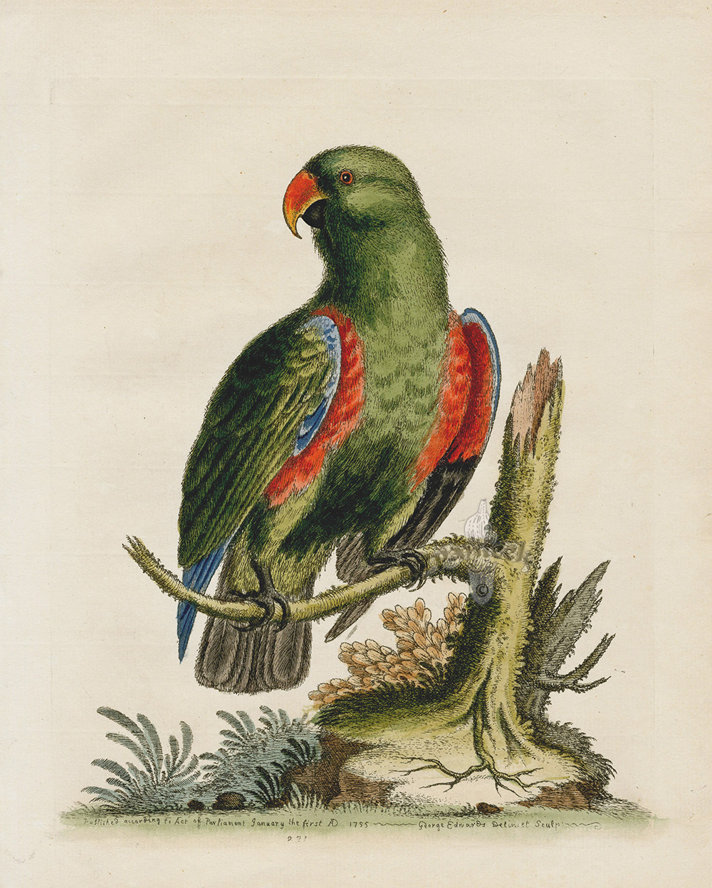 George Edwards was an English draughtsman and a skilled observer of birds and one of the most prominent ornithologists of his day. He worked as Librarian to the Royal College of Physicians, where he was later elected a fellow, and was honored with the Gold Medal of the Royal Society. As the Librarian to the Royal College of Physicians, he oversaw a library of 8,000 volumes. The small honorarium he received for this post liberated him to pursue his ornithological studies and drawings. He died in West Ham, which was also his birthplace, in 1773.